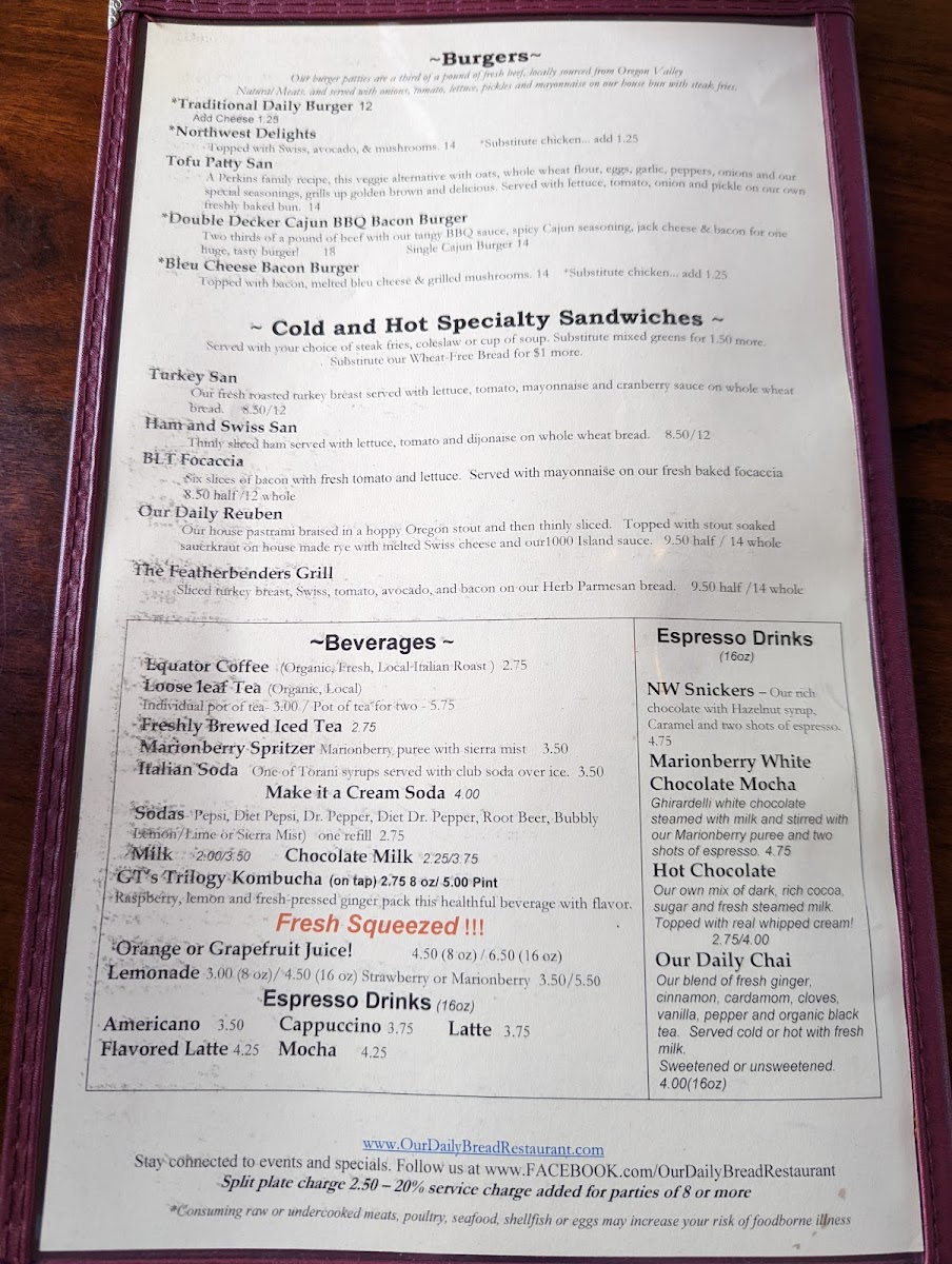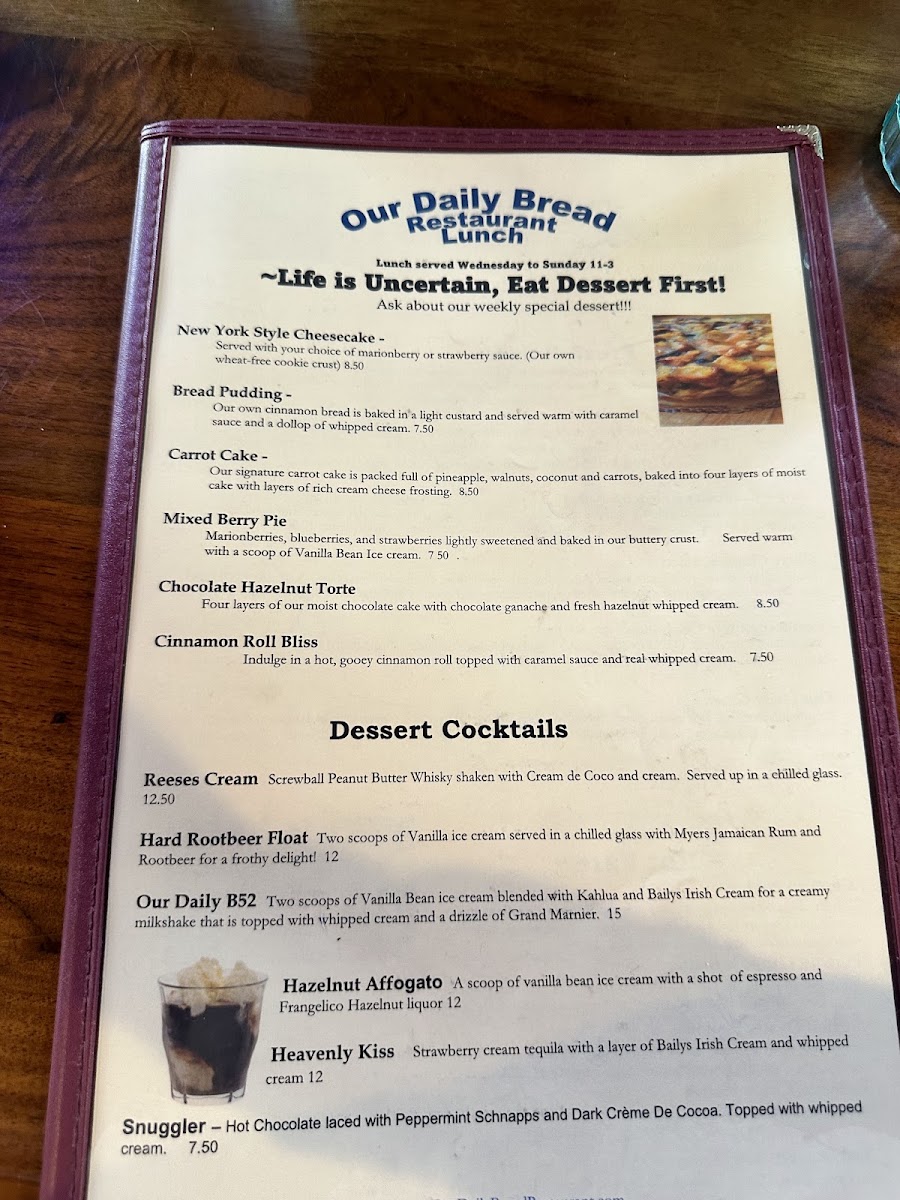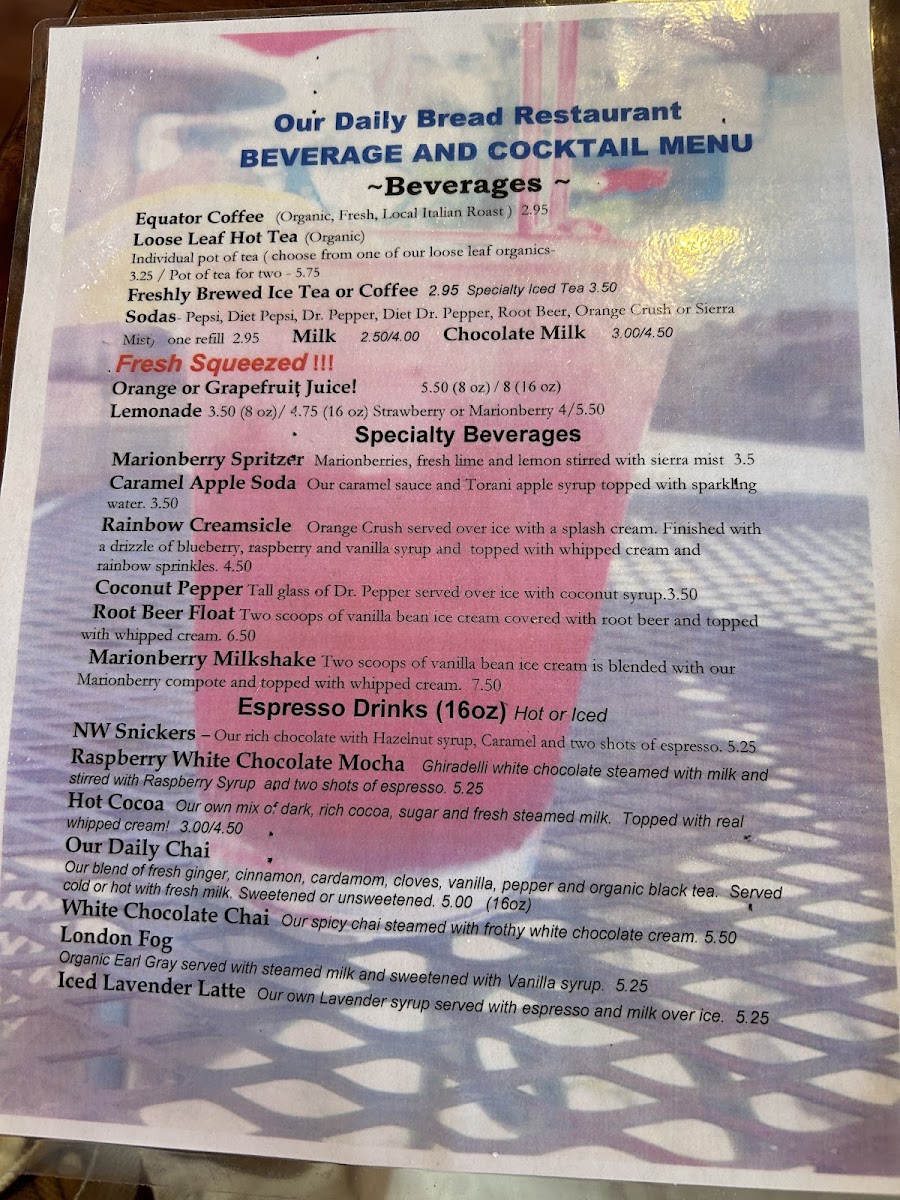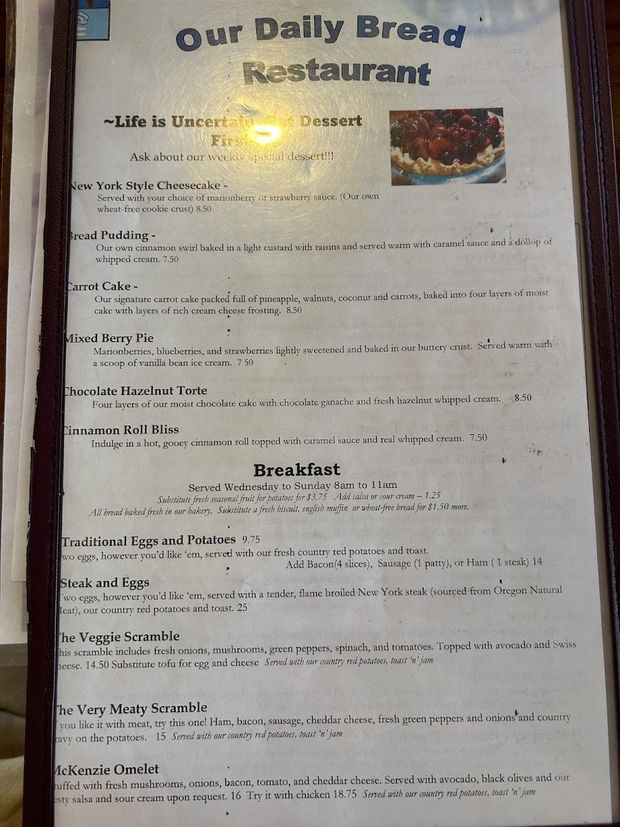 The menu at Our Daily Bread Restaurant offers a welcoming blend of classic American comfort food and fresh bakery favorites, thoughtfully designed for a relaxed dining experience. You’ll find simple café-style options alongside heartier breakfast dishes and comforting lunch plates, perfect for starting your day or enjoying a casual meal any time.